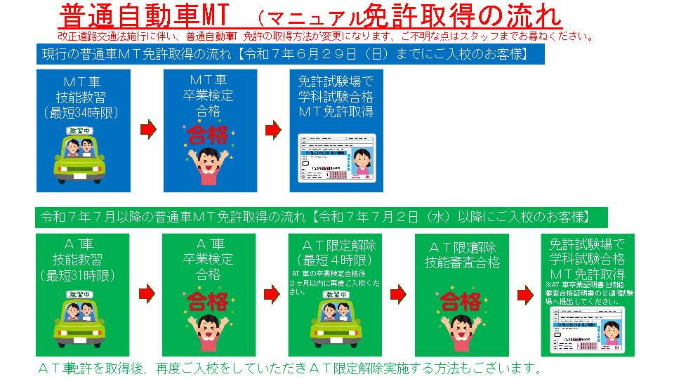 法改正に伴い、9月27日(土)の入校を持ちまして、当校では普通自動車免許の教習のうち、MT免許単独での入校は終了いたします。